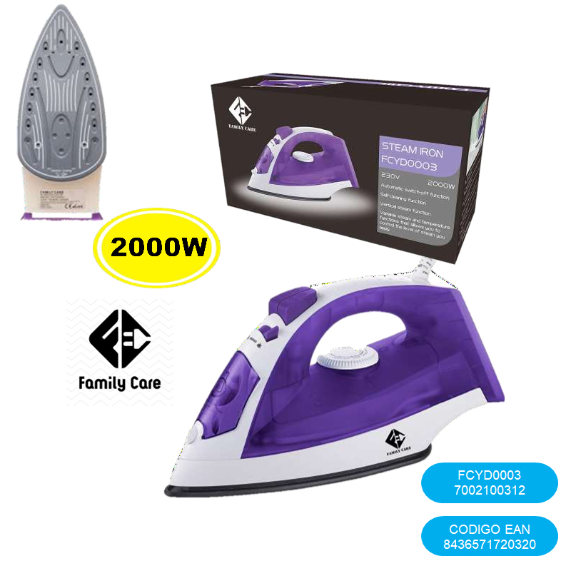 Plancha De Vapor, Suela Cerámica Antiadherente,  2000W, 140 ML, Anti Goteo, Auto Limpieza, Color  Blanco y Morado Family Care